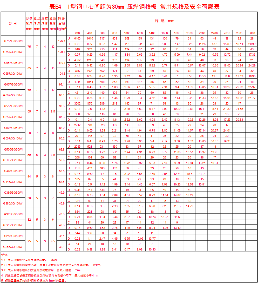 附錄表E.4 承載扁鋼為Ⅰ型鋼,中心間距為30mm壓焊鋼格板。