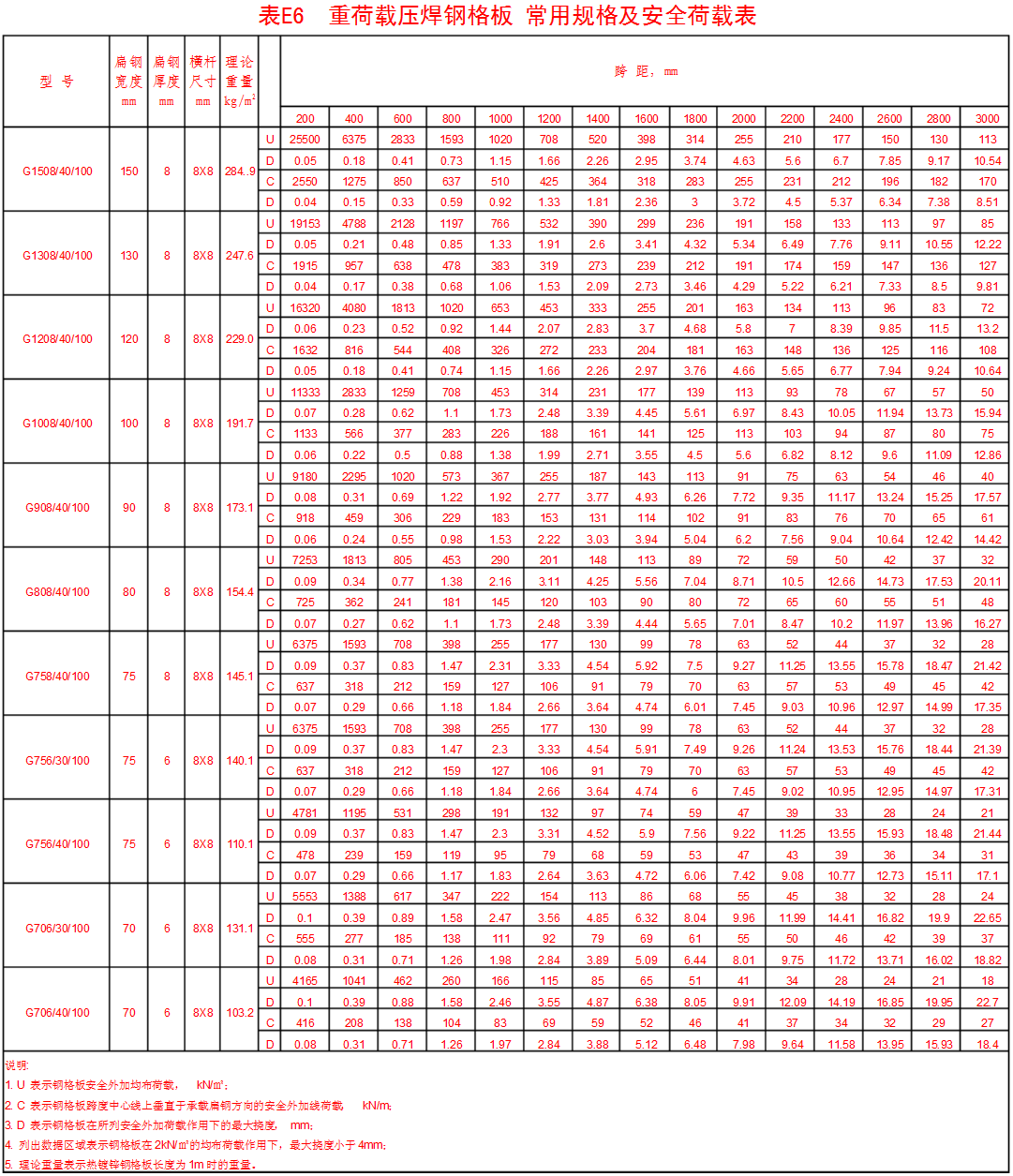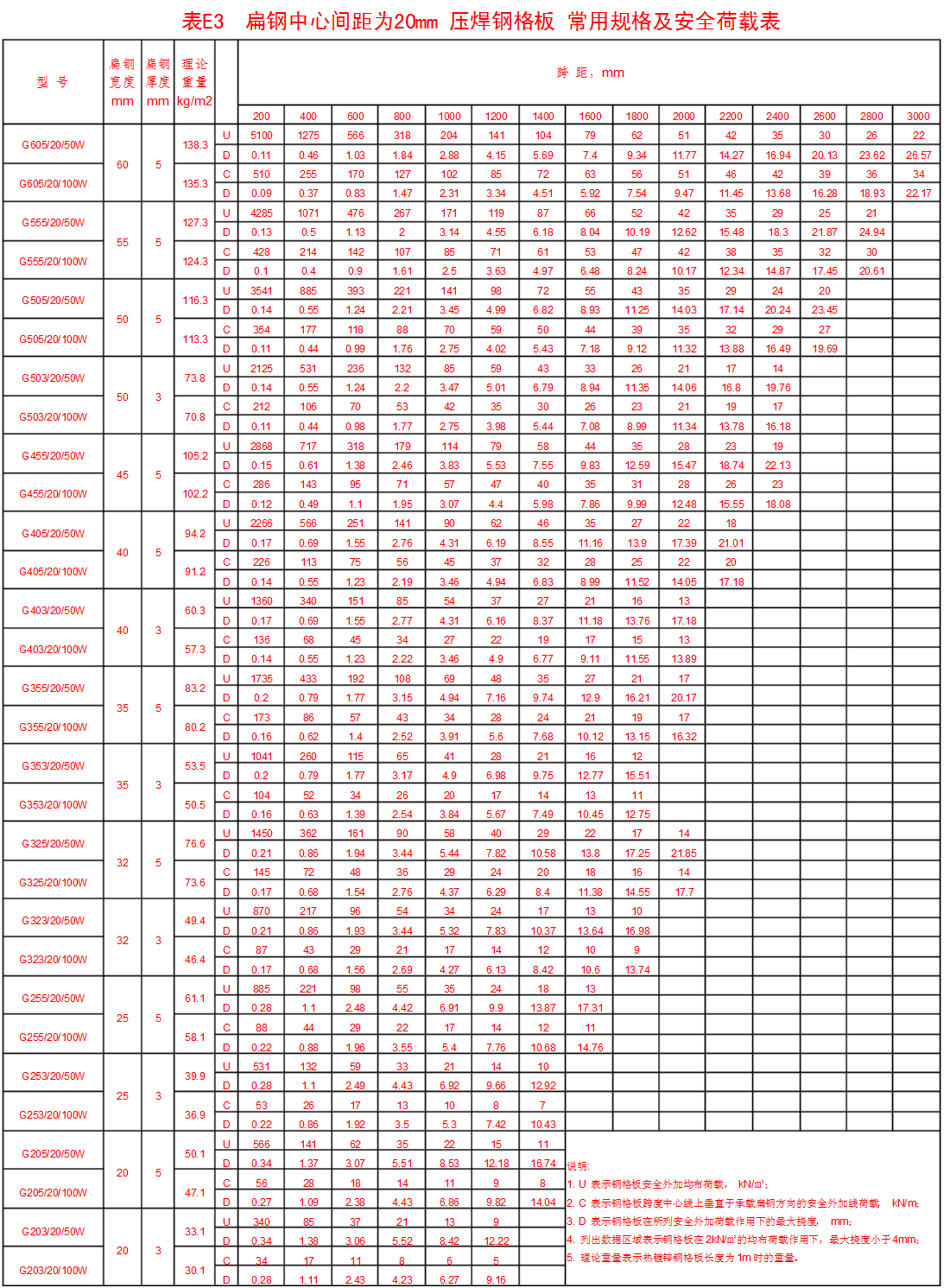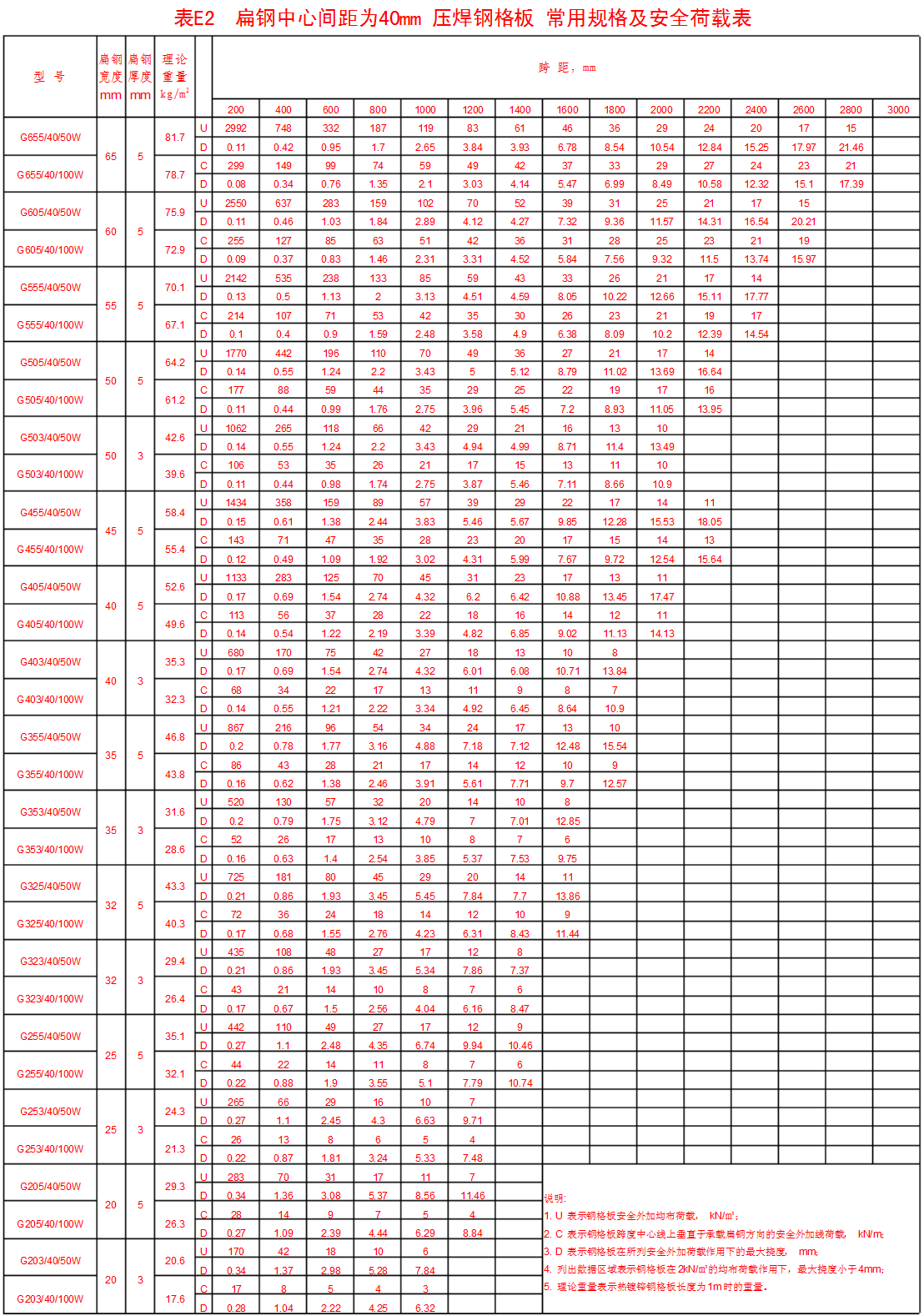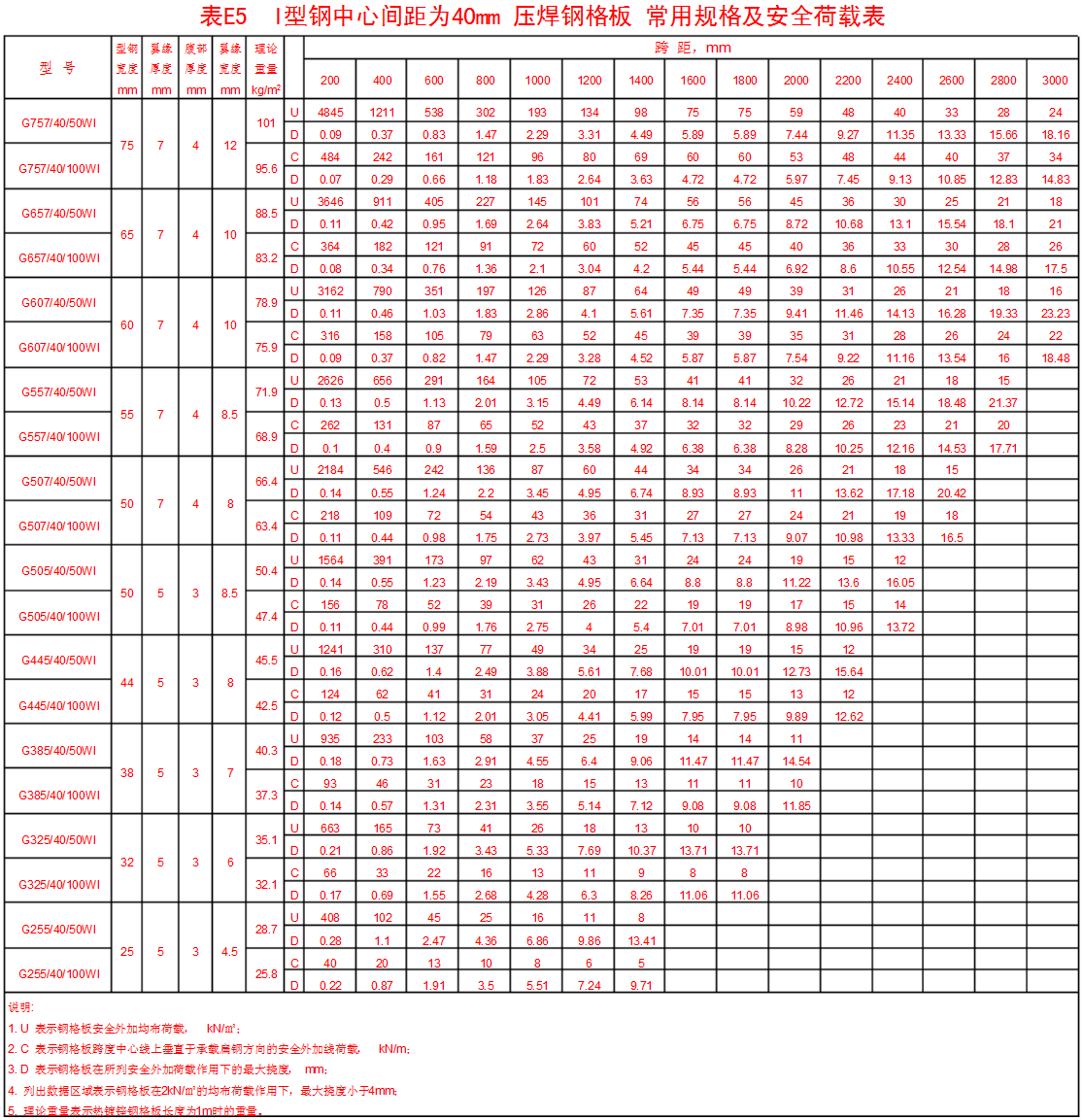 附錄表E.5 承載扁鋼為Ⅰ型鋼,中心間距為40mm壓焊鋼格板。