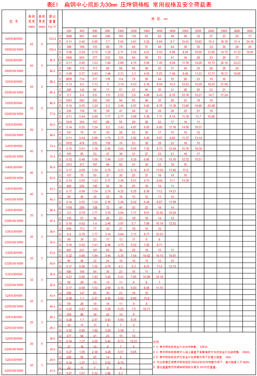 附錄表E.1 承載扁鋼,中心間距為30mm壓焊鋼格板。