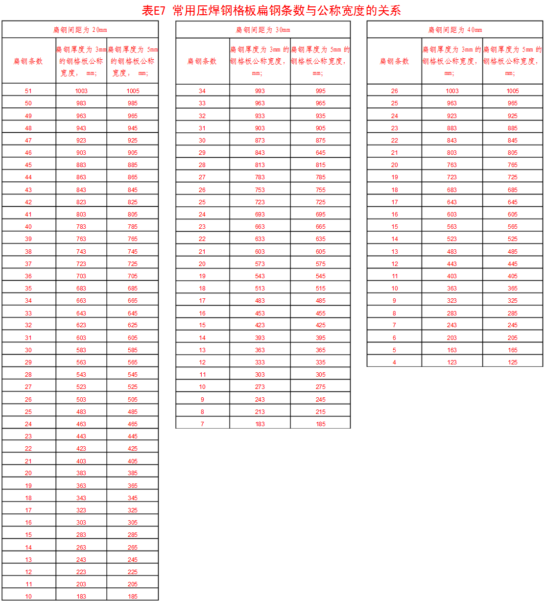 附錄表E.7 常用鋼格板扁鋼條數(shù)與公稱寬度的關(guān)系。